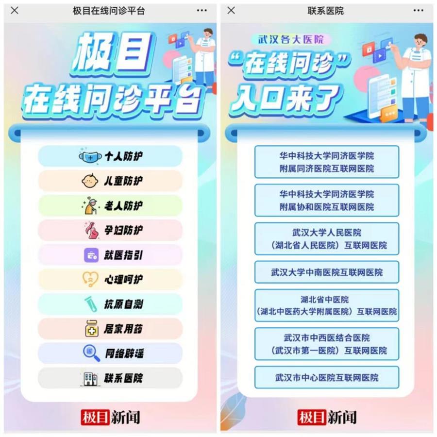 点击网址或扫码进入小程序,点击屏幕即可进入极目在线问诊平台。极目在线问诊平台包括有12个条目,分别是个人防护、儿童防护、老人防护、孕妇防护、就医指引、心理呵护、抗原自测、居家用药、网络辟谣、联系医院、发热门诊地图、新冠疫苗一站通。