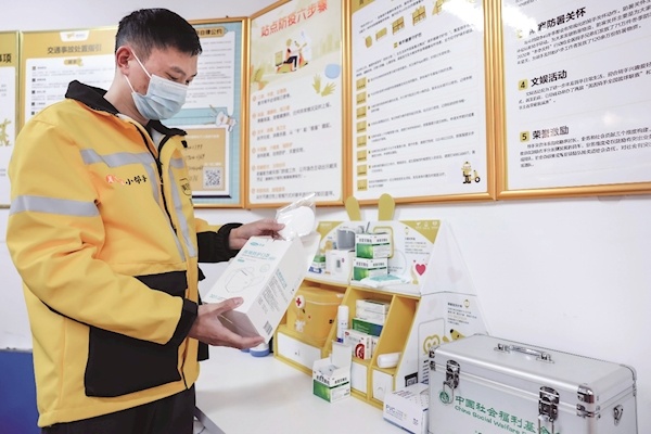 骑手在站点领取药品和防疫物资 摄影:楚天都市报极目新闻通讯员胡阅