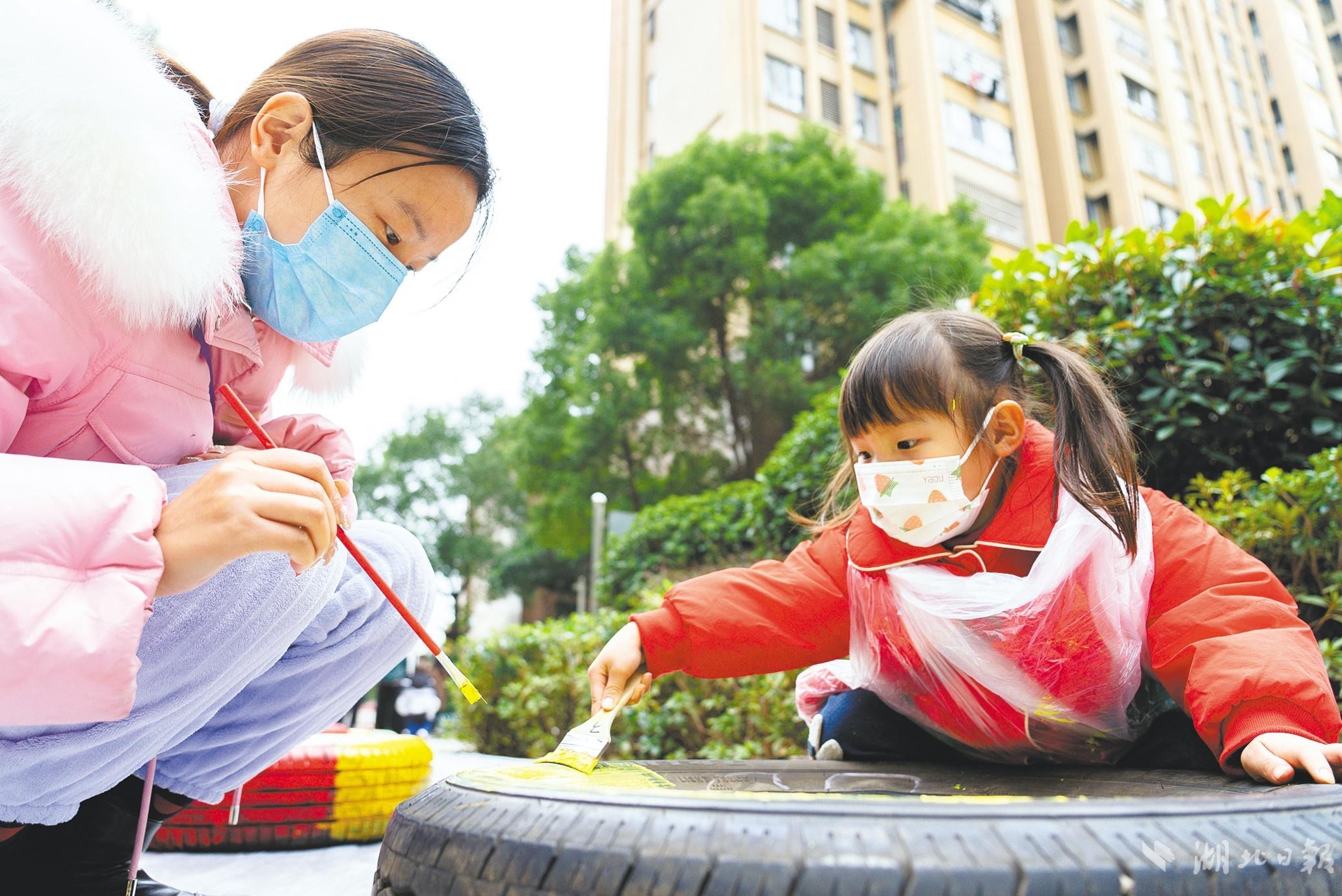 熙龙湾社区,家长和孩子一起进行废旧轮胎涂鸦,用来种植树木,扮靓社区环境。