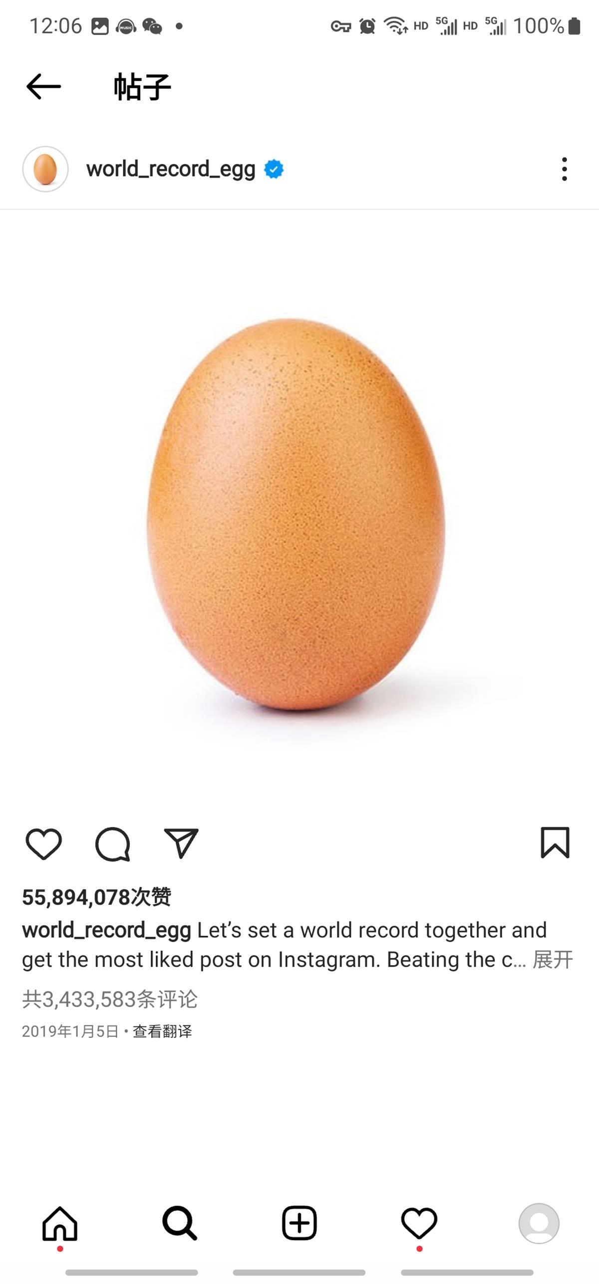 而该平台当前照片点赞数的最高纪录保持者,是一张鸡蛋照片,发布于2019年1月5日。梅西发布动态后,不少网友涌入鸡蛋照片的评论区,留言刷屏称希望梅西登顶第一。因此,鸡蛋照片的点赞数现在反而在下跌,目前已跌至5589万。