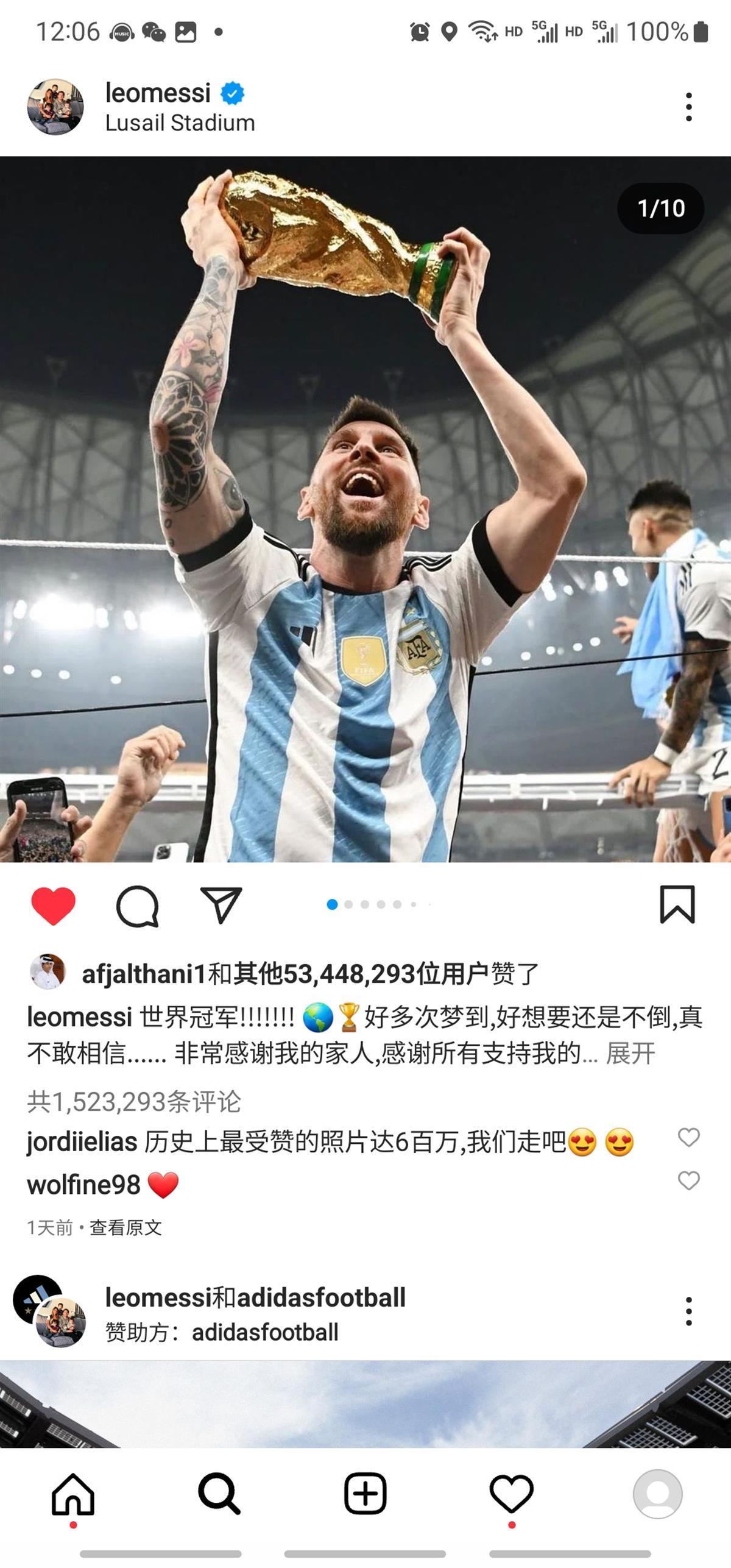 截至北京时间20日中午12时,梅西的这条动态点赞数已超过5344万,并且还在上涨。