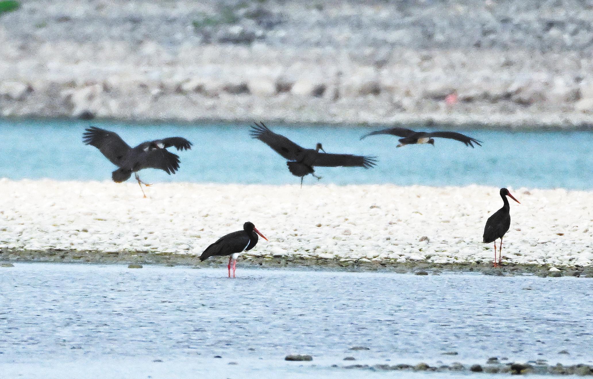 珍稀的黑鹳鸟群。