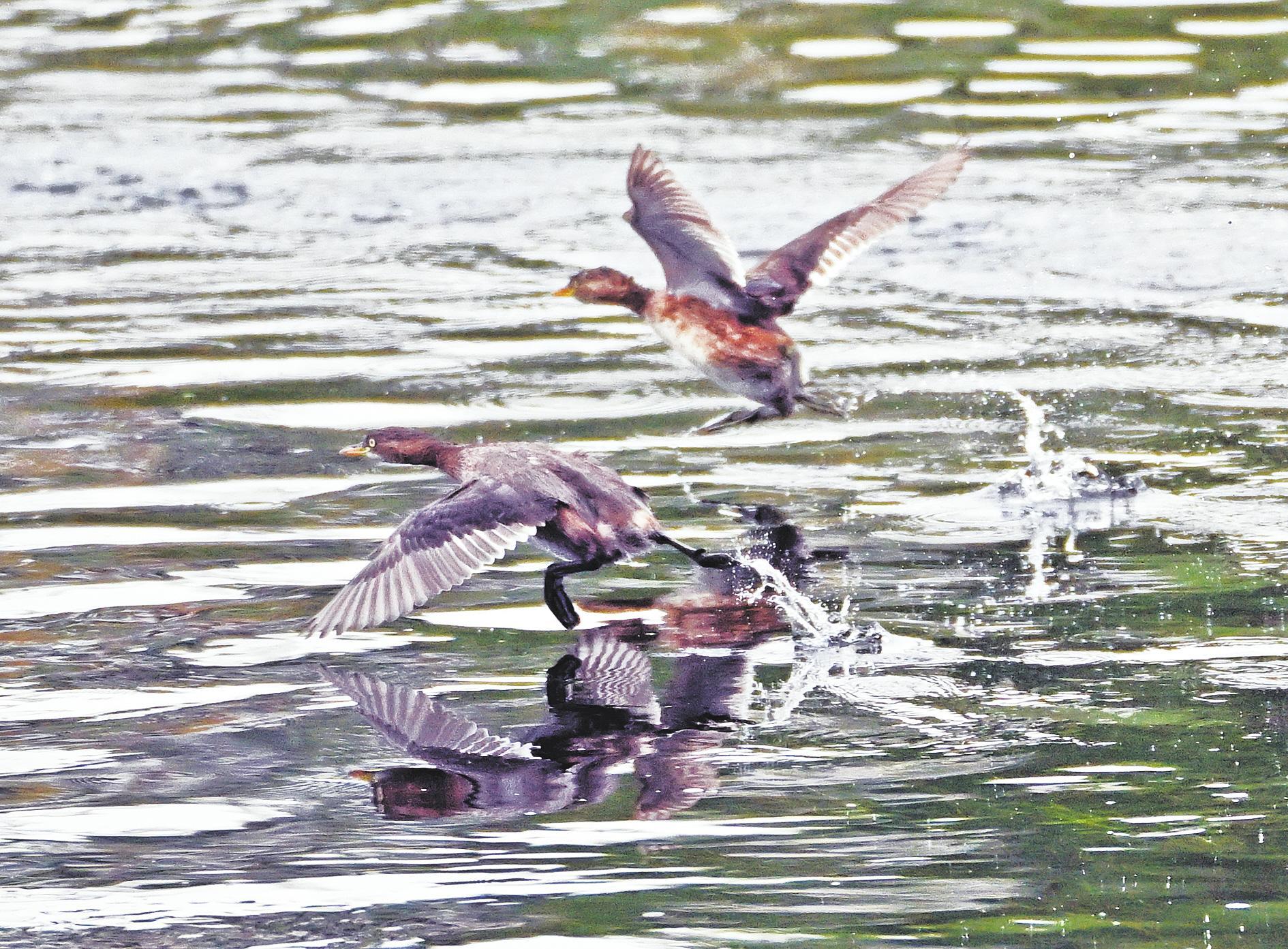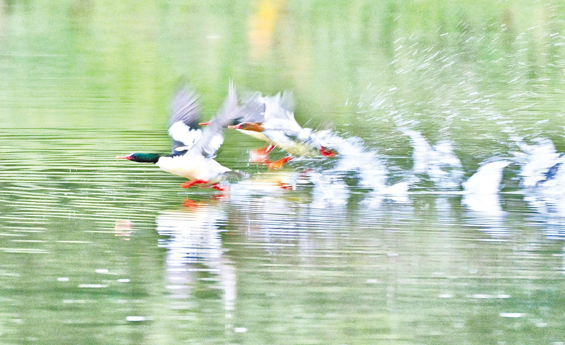 中华秋沙鸭掠过水面。