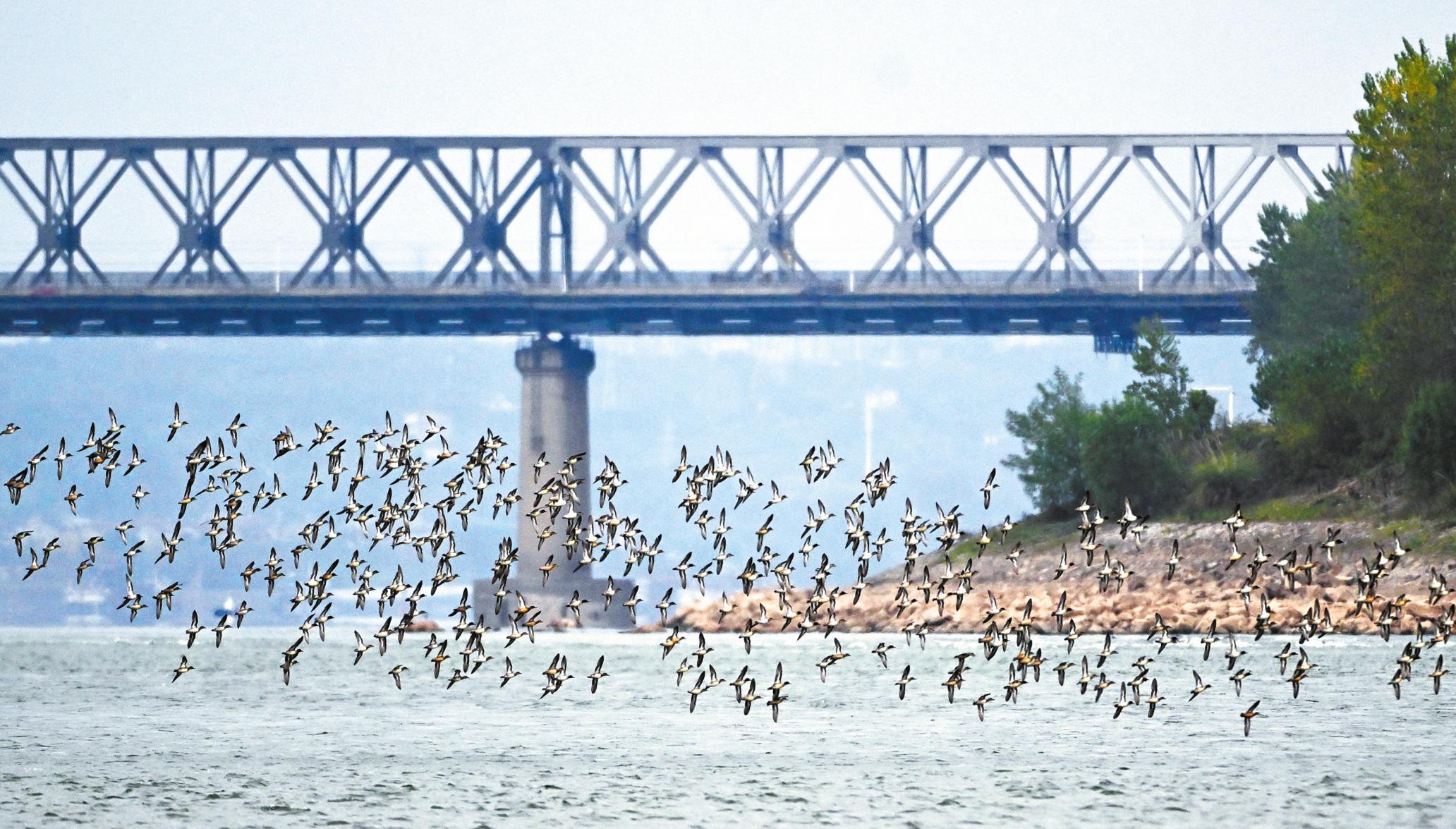 枝城长江大桥下群鸟翔集。