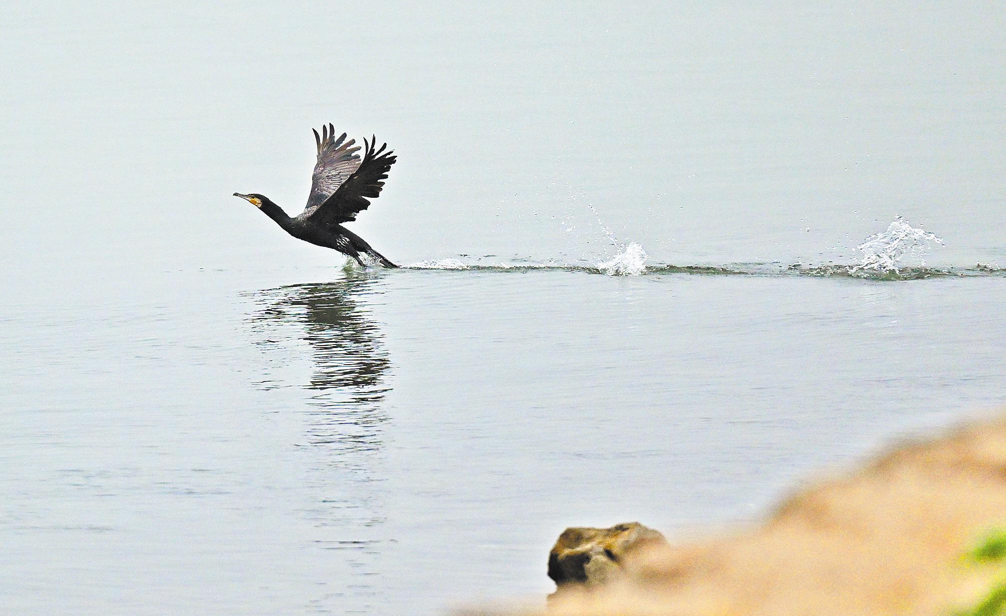 鸬鹚在长江上飞行。