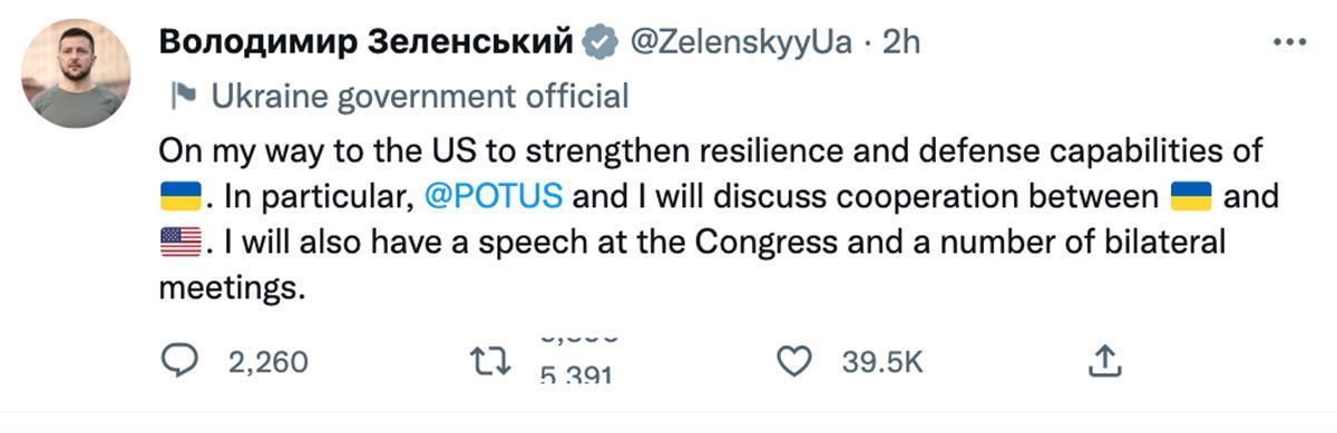 泽连斯基在推特上写道:“我正在前往美国的途中,以加强乌克兰的复原力和防御能力。尤其是会讨论美国与乌克兰的合作。我将在国会讲话并参加一系列双边会议。”