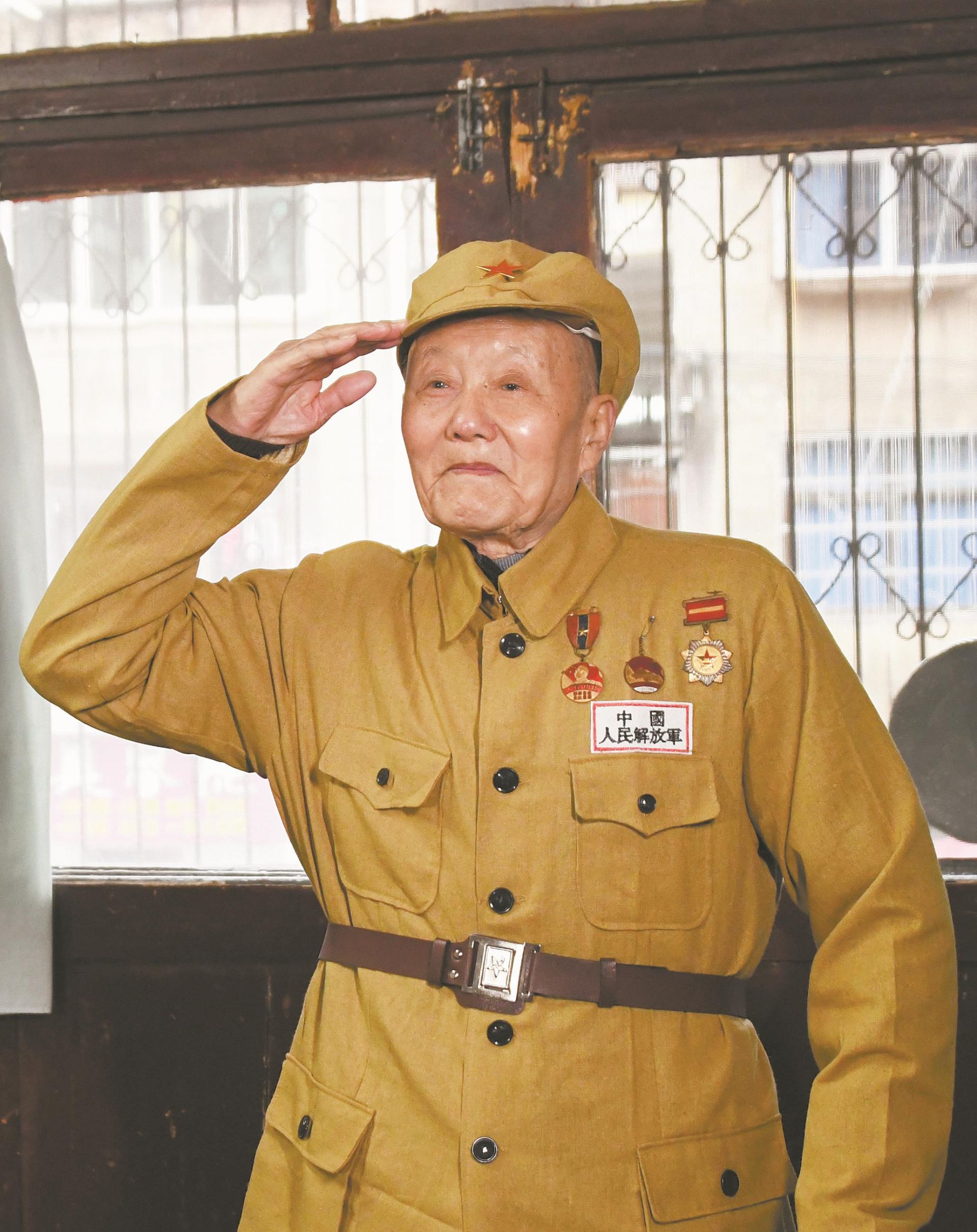 张富清穿着老式军装敬军礼(2019年3月31日摄) 新华社发