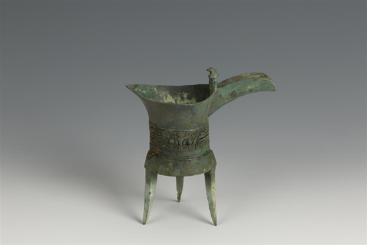 盘龙城博物院还收藏有与爵外形相似的铜斝(jiǎ)。 斝,形状与爵相似,都有三足一鋬,敞口,口部多立有两个柱。斝和爵不同的地方在于斝没有流和尾,且体形一般比较大。斝出现于二里头文化时期,流行于商代至西周早期,而后不见。