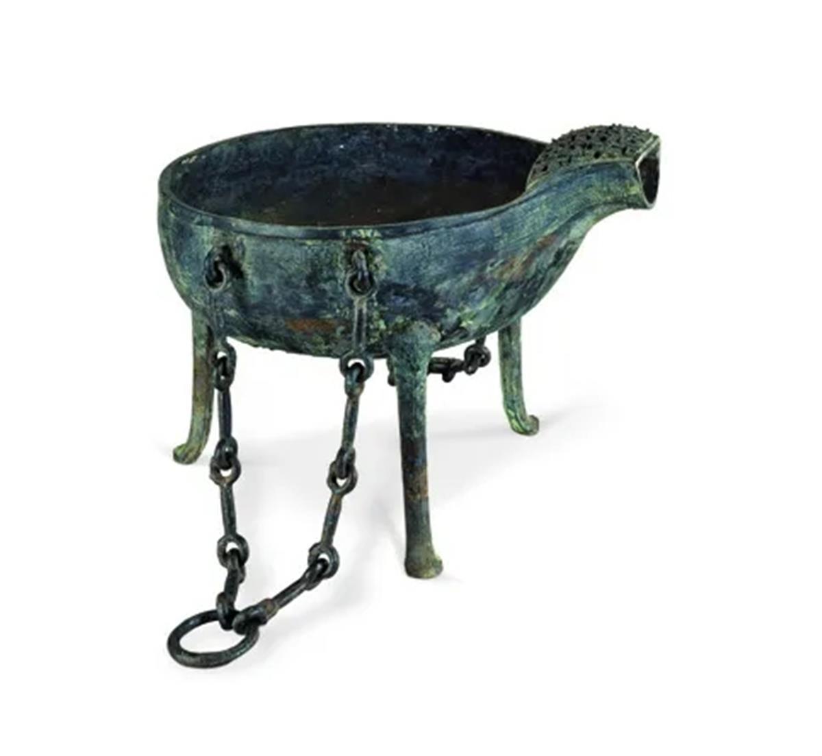 据湖北省博物馆社教部介绍,曾侯乙墓中还出土了一件匜鼎,器身像匜,三足像鼎,因此称其为匜鼎。有半圆形流,流上有镂孔盖,平底,三蹄形瘦长足。腹部有对称的两对耳钮,每对钮上套接一副提链,提链由四节双连环套接,每副提链末端套接一个圆圈提环。出土时底部有烟灰痕迹,应为沐浴前的烧水之器。寒冷的冬天洗个热水浴,岂不温暖倍增!