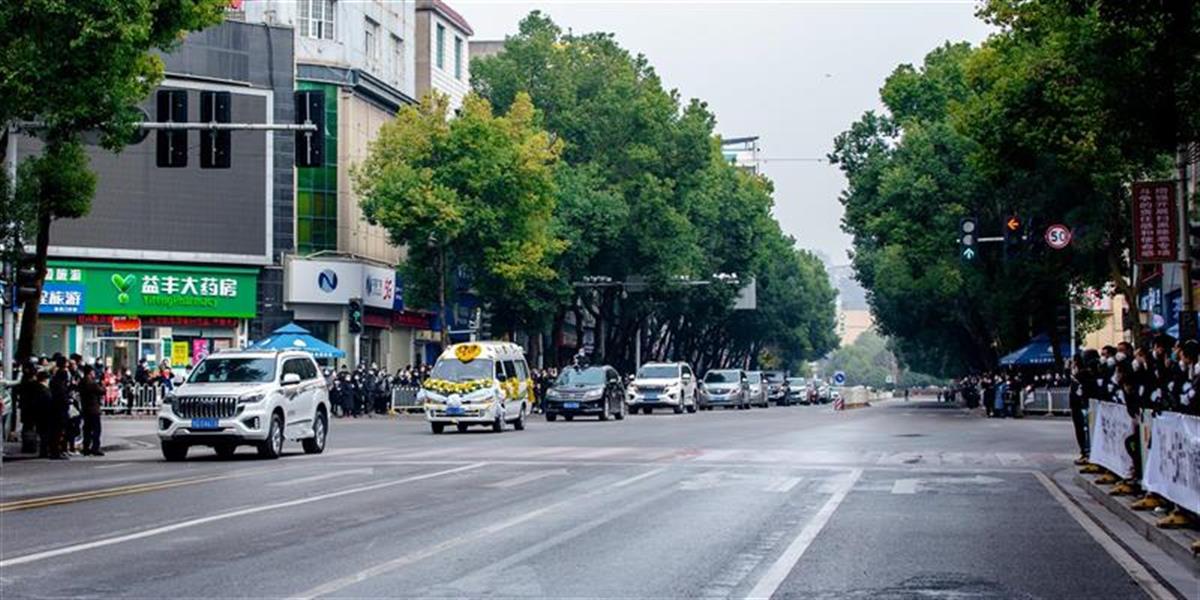 上午11时30分许,灵车驶入凤仪大道,驶向高速入口。“我是党培养的干部,党需要我去哪里,我就去哪里。”道路右侧的巨幅路牌上,老英雄留下的语录,在阳光下格外耀眼。