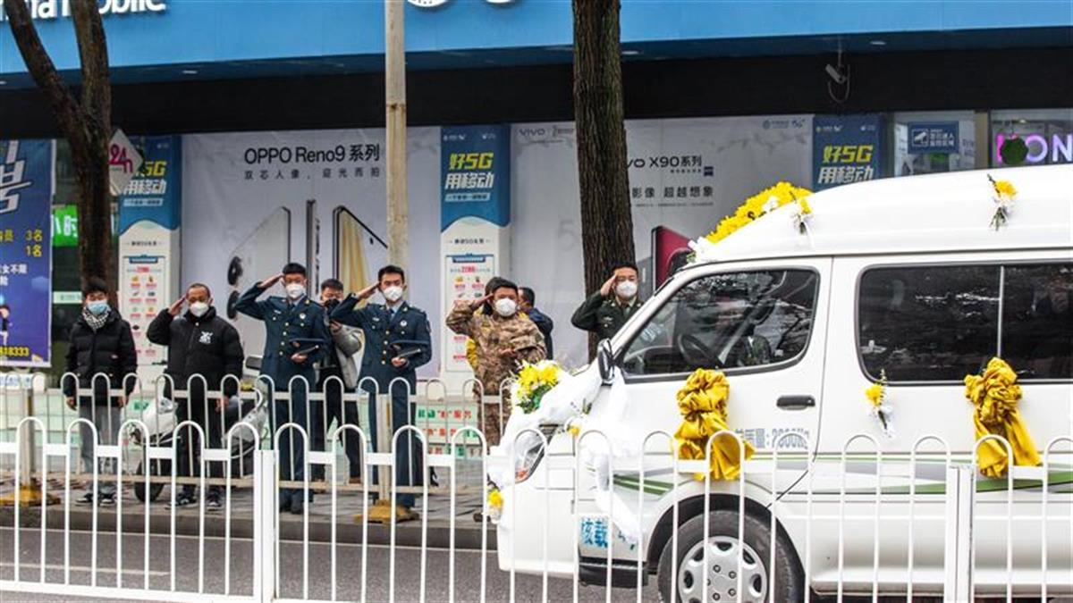 上午11时许,灵车缓缓驶出殡仪馆,驶过老英雄生活、工作了数十年的来凤县城。人群中,一声声“老英雄走好!”让人听了心碎不已。人民警察、解放军战士、消防官兵们脱帽肃立,面向灵车敬礼。