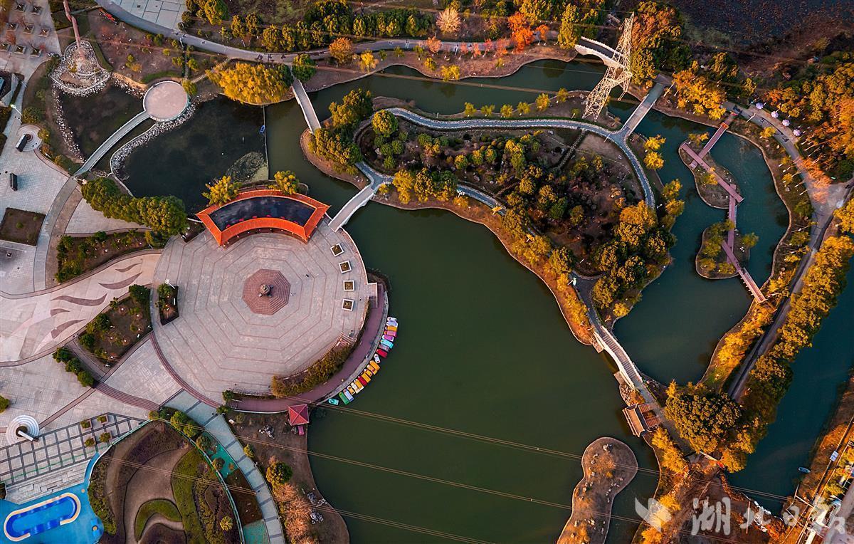 12月18日,航拍提档升级后的谭鑫培公园,镜头下一条婉转流淌的河道上架有七座人行步桥清楚可见。