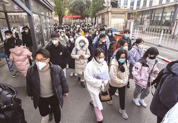 昨日,为期三天的2023年全国硕士研究生招生考试拉开帷幕。湖北省共有21.6万名考生参加考试,创下历史新高。图为第一场考试结束后,湖北大学考点的考生们有序走出考场。 楚天都市报极目新闻记者肖颢 王永胜摄