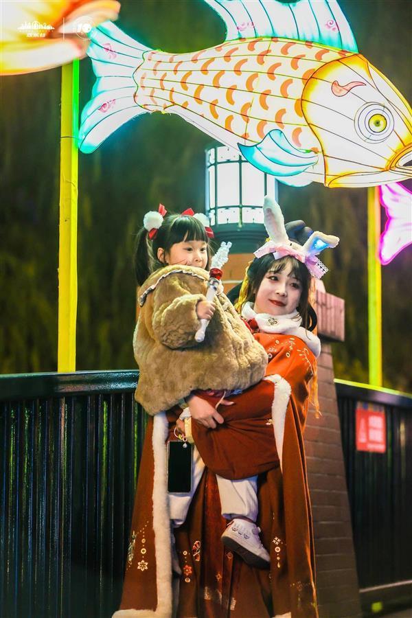 周六天气晴好,不少年轻游客早早换上汉服、玩偶发饰,画上漂亮的节日妆来到欢乐谷,期待一年一度的亮灯仪式。园区造型各异的大鱼灯吸引了游客的目光。今年欢乐谷特别邀请自贡匠人手制花灯,创造可爱IP锦鲤“呼呼”,它是武汉欢乐谷的“御用配送员”,虽然是个贪吃贪睡的小迷糊,却积极把欢乐传递给所有人。