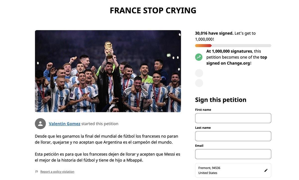 而根据法国BFMTV电视台报道,针对法国队球迷的签名活动,阿根廷队球迷在change.org上发起了一项“法国别哭了”的签名活动。发起这项签名的网友称:“自我们在世界杯决赛中击败他们以来,法国人一直在哭泣、抱怨并且不接受阿根廷是世界冠军。”该网友还特别要求法国人接受梅西是“足球史上最好的球员”,姆巴佩是“他的孩子”。
