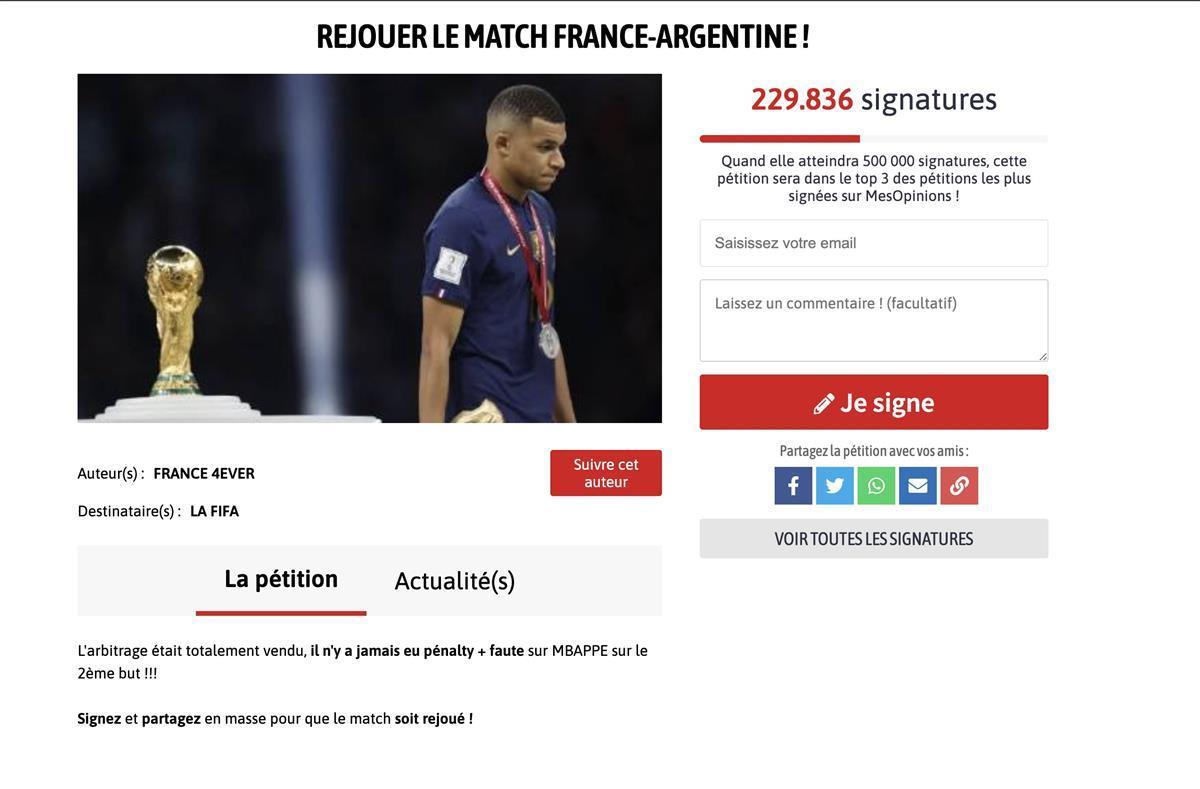 据阿根廷媒体infobae报道,在请愿网站MesOpinions上,一名法国队球迷发起签名活动,要求国际足联重新组织法国队和阿根廷队之间的决赛,理由是波兰籍主裁判判罚不公。该网友称,裁判未对迪马利亚的犯规判罚点球,导致了姆巴佩错失一个进球,并要求网友集体签名要求重赛。