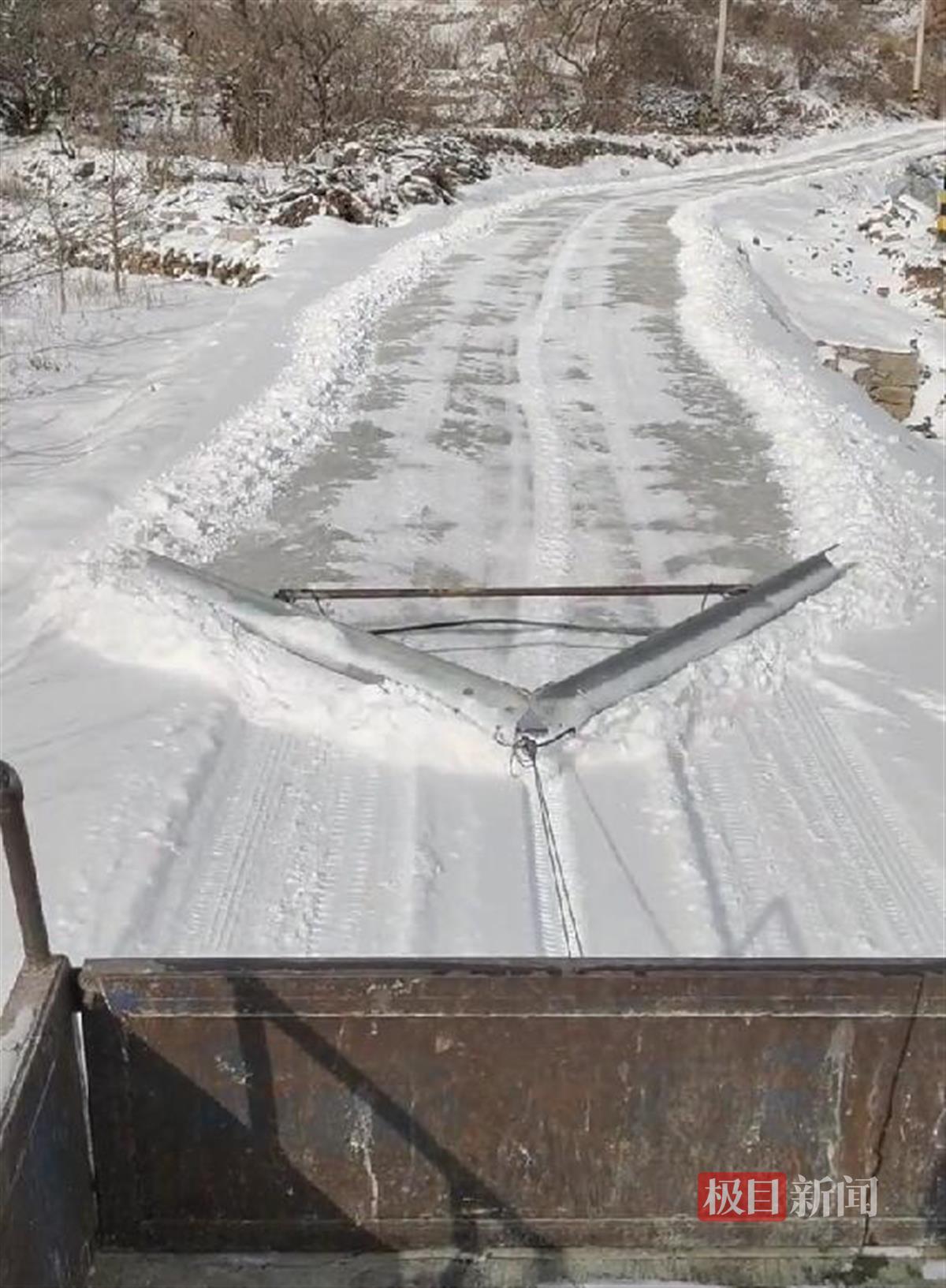 林先生介绍,扫雪工具主要由2个长约2.1米、宽25厘米的钢板和一根钢管组成。他和另一名村民,用了一上午时间,将钢板和钢管焊接成了一个三角形金属工具,成本仅几百元,“没想到用起来效果不错。”