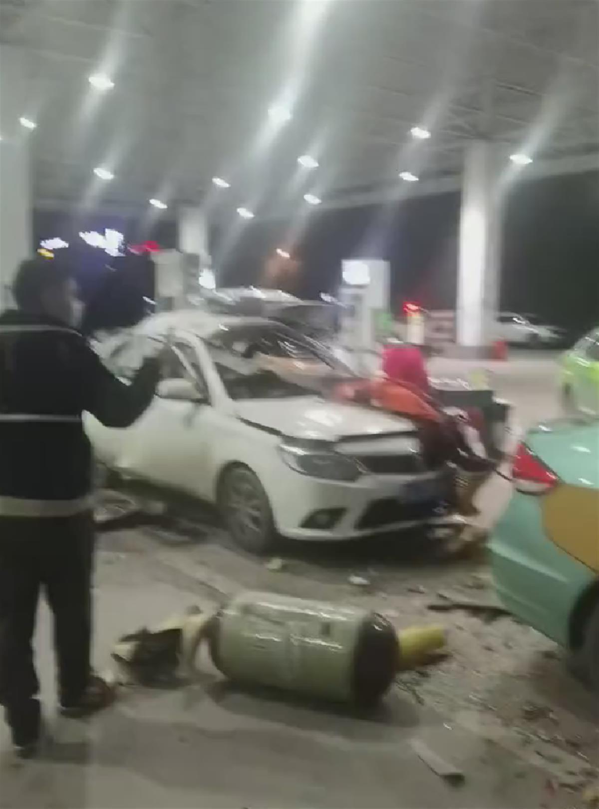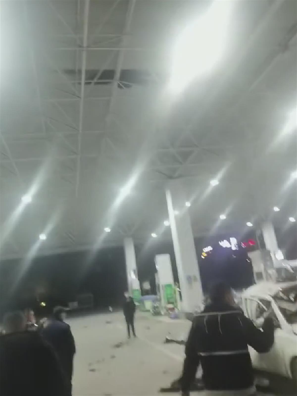 爆炸发生在巴州区津桥湖加油加气站内。视频显示,一辆白色汽车车身被炸变形,储气罐掉落在地上,加气站顶篷被炸出一个窟窿,现场另有几辆车正在排队。