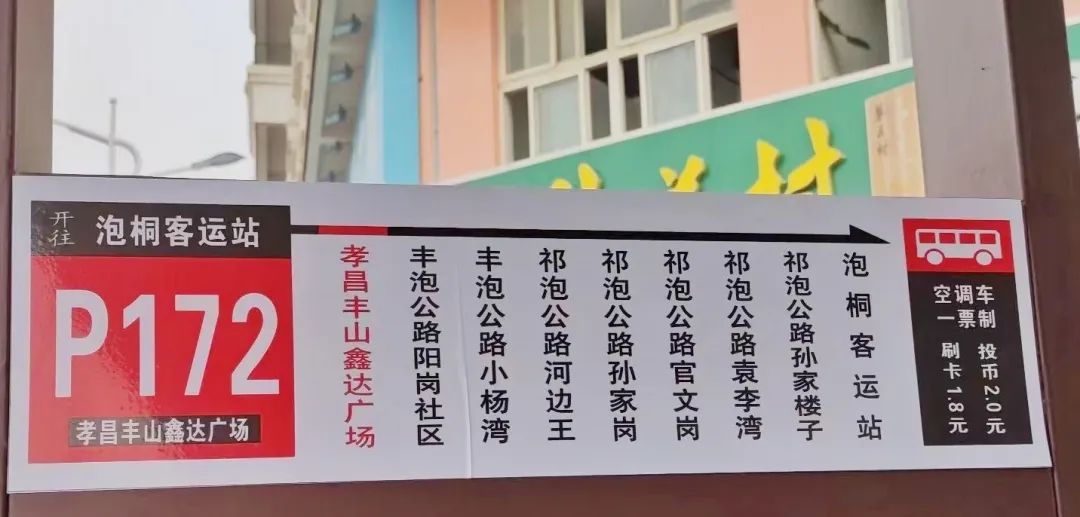 孝昌县丰山镇至黄陂区泡桐镇公交专线全长约6.5公里,共经过9个站点,黄陂区泡桐客运站和孝昌县丰山镇鑫达广场为公交首末站。孝昌县丰山镇鑫达广场首末班时间分别为早上6:10和下午5:00,平均间隔30分钟,循环发班,票价为一票制2元,国家政策规定的优抚对象免费乘车。