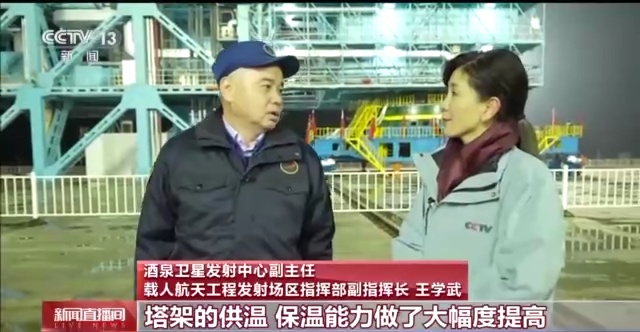 酒泉卫星发射中心副主任 载人航天工程发射场区指挥部副指挥长 王学武:这次神舟十五号发射是载人航天飞行任务温度最低的一次,塔架的供温、保温能力做了大幅度提高。以前空调的供热功率是152千瓦,现在增加到527千瓦,相当于提高了三倍多,尽最大可能给产品、给航天员提供一个更好的环境。