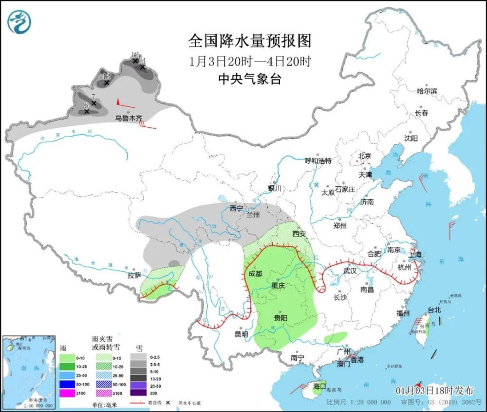 1月3日20时至4日20时,新疆北部、西藏东部、青海中南部、甘肃南部、陕西西南部、川西高原北部等地部分地区有小到中雪或雨夹雪,其中,新疆塔城、阿拉泰和伊犁河谷等地部分地区有大到暴雪(10~15毫米)。四川盆地、重庆、贵州、云南东部、广西北部、海南岛东北部等地部分地区有小雨。