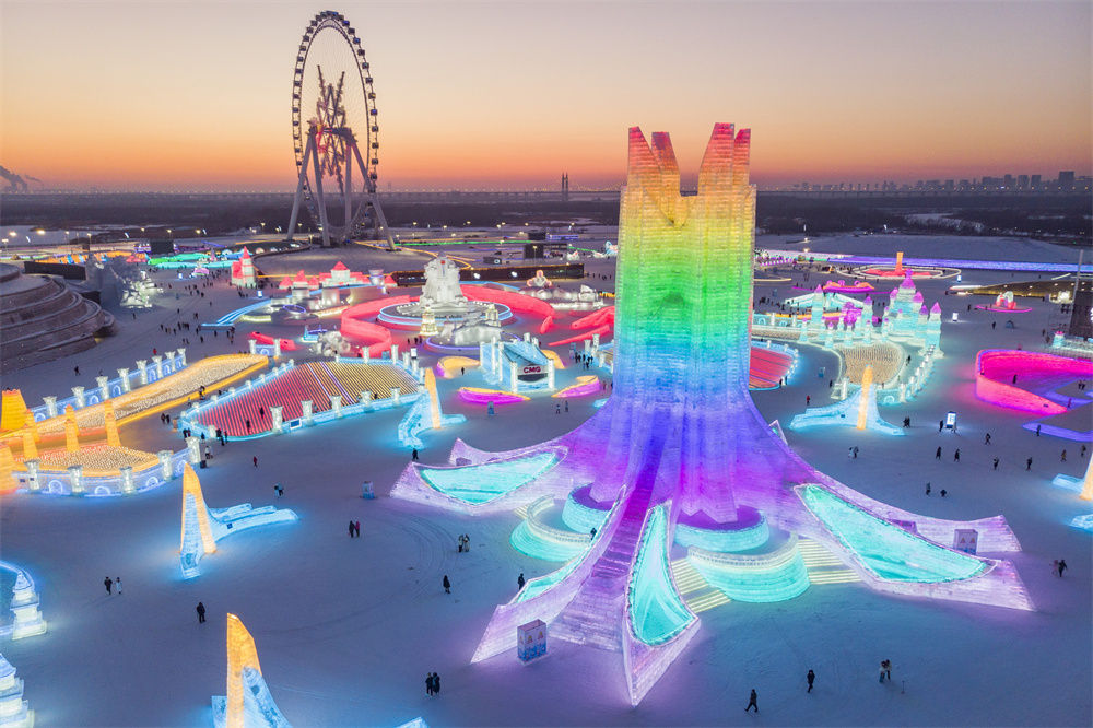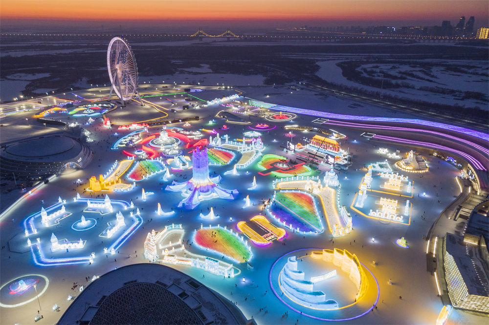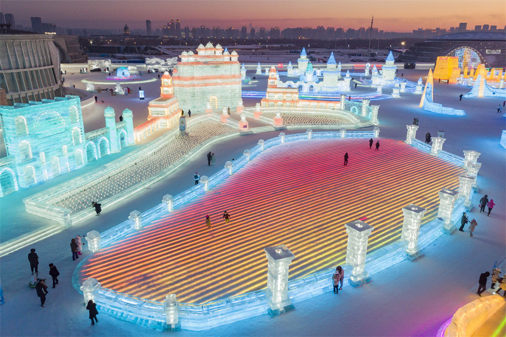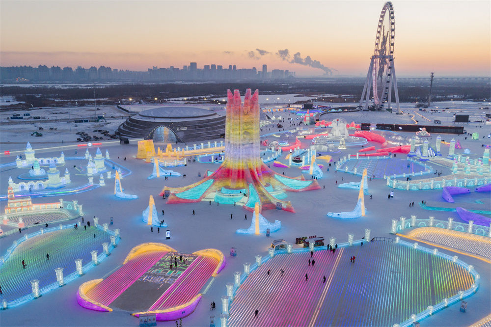 冬日夕阳下,第24届哈尔滨冰雪大世界园区流光溢彩,梦幻壮观,来自天南海北的游客在园区内畅享冰情雪趣。