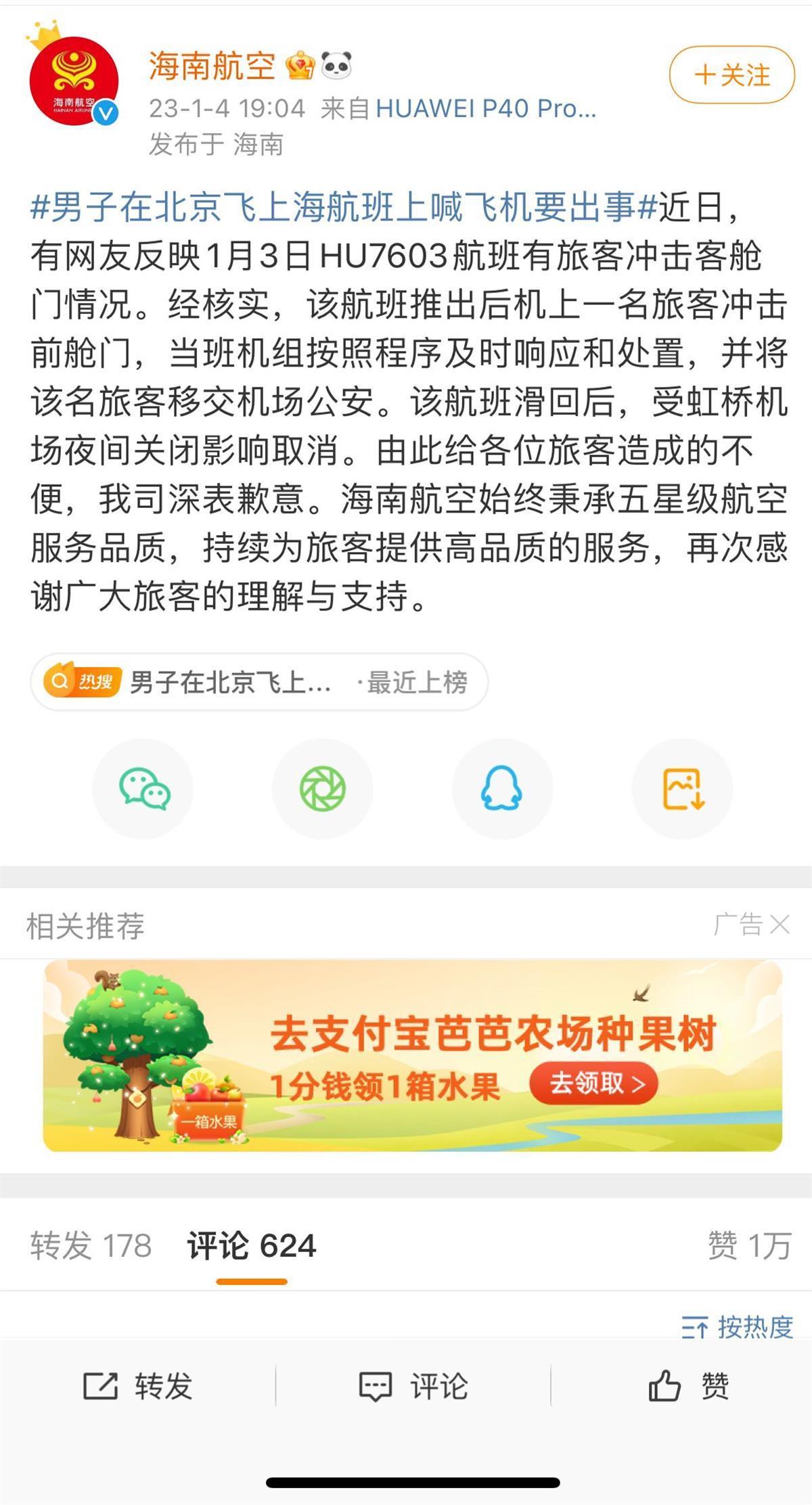 1月4日晚,海南航空官方微博就此事发布了通告,称有网友反映1月3日HU7603航班有旅客冲击客舱门情况。经核实,该航班推出后机上一名旅客冲击前舱门,当班机组按照程序及时响应和处置,并将该名旅客移交机场公安。该航班滑回后,受虹桥机场夜间关闭影响取消。