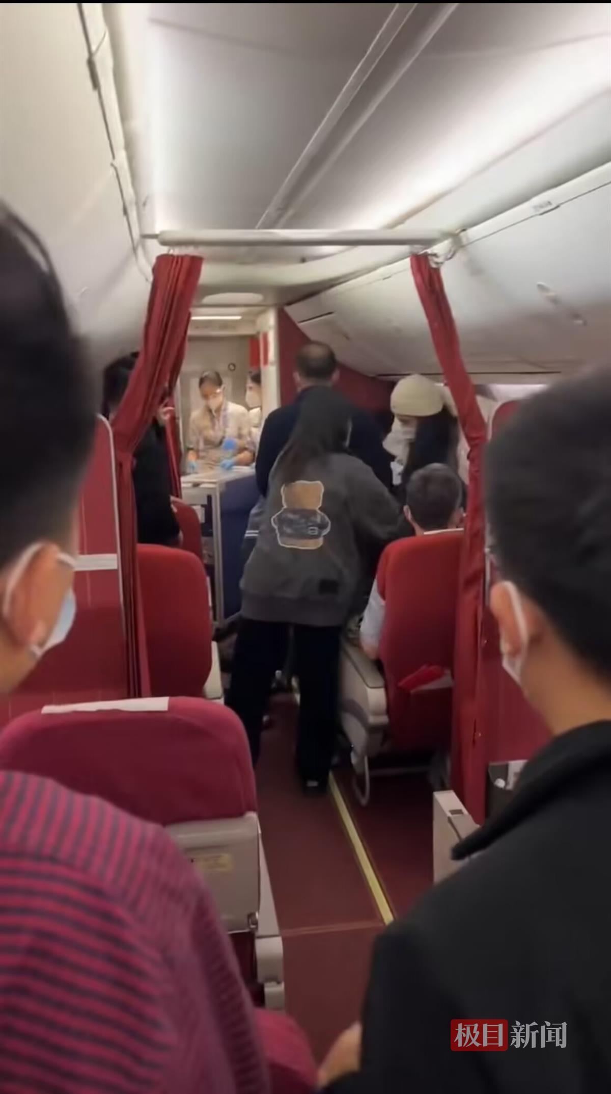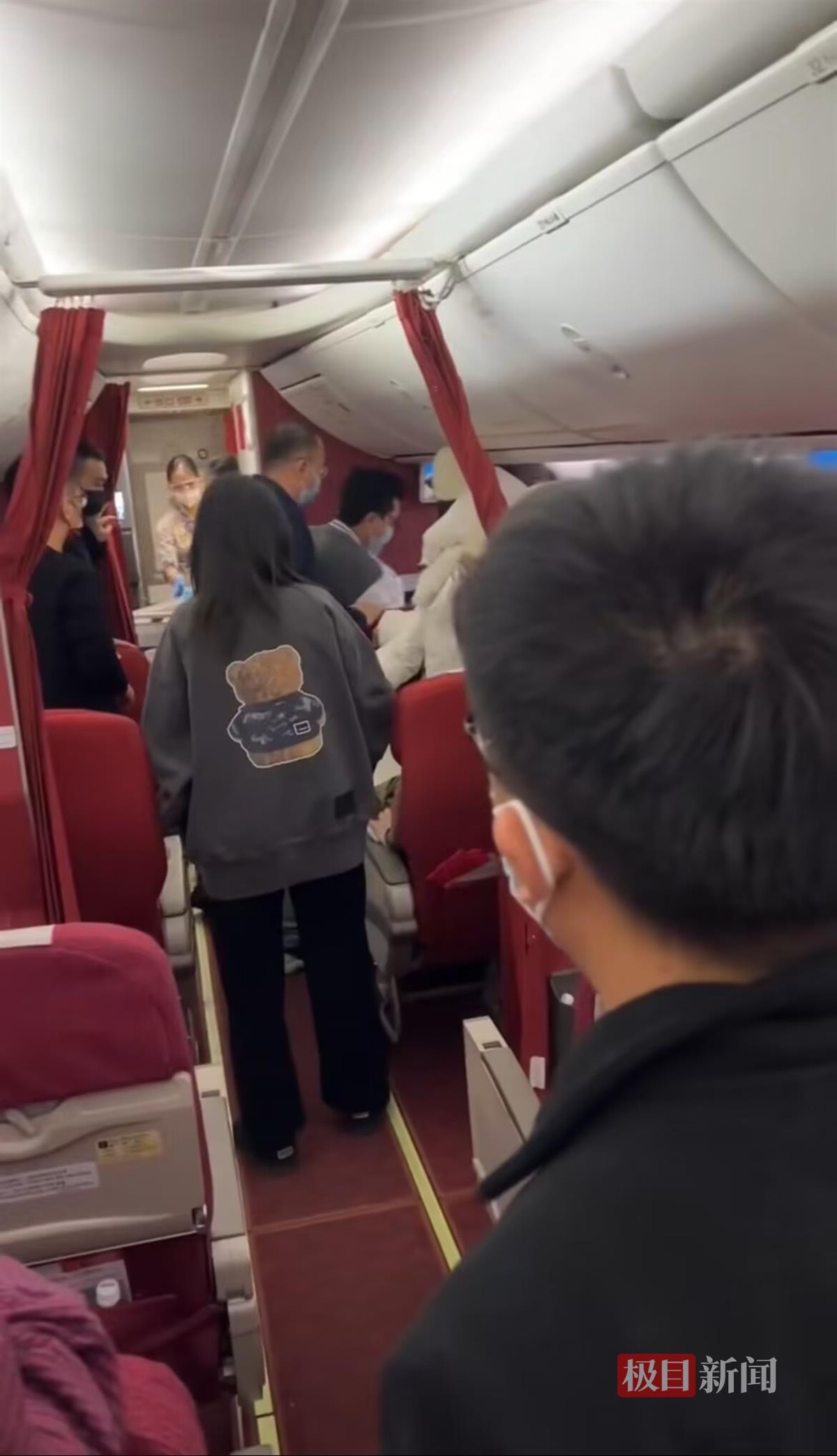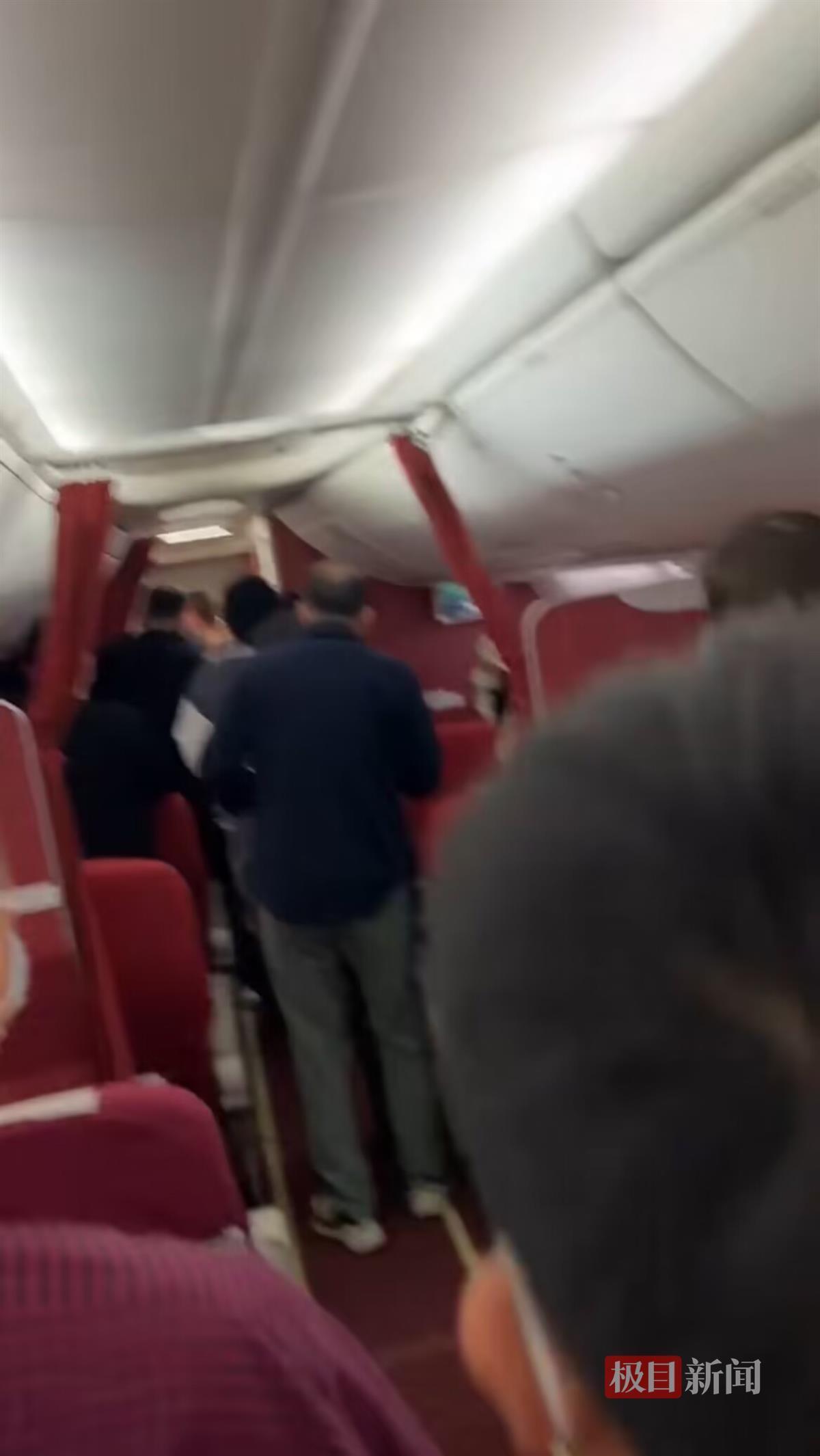 乘客陈悦告诉极目新闻记者,她全程目睹了这场突如其来的变故,1月3日晚9时05分,飞机已经推出了机位,在跑道上等待起飞。她坐在经济舱前四排的座位,当时她正低着头玩手机,突然听到机舱靠后的位置传来一阵骚动。