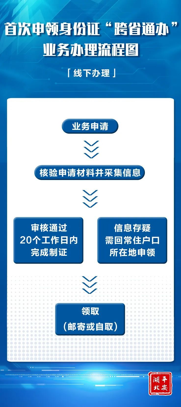 受理信息传送至申请人常住户口所在地公安机关进行审核,可确认申请人身份信息准确无误的,于五个工作日内审核签发,对申请人身份信息存疑,经核查仍难以确认身份的,申请人需回到常住户口所在地公安机关申领居民身份证。