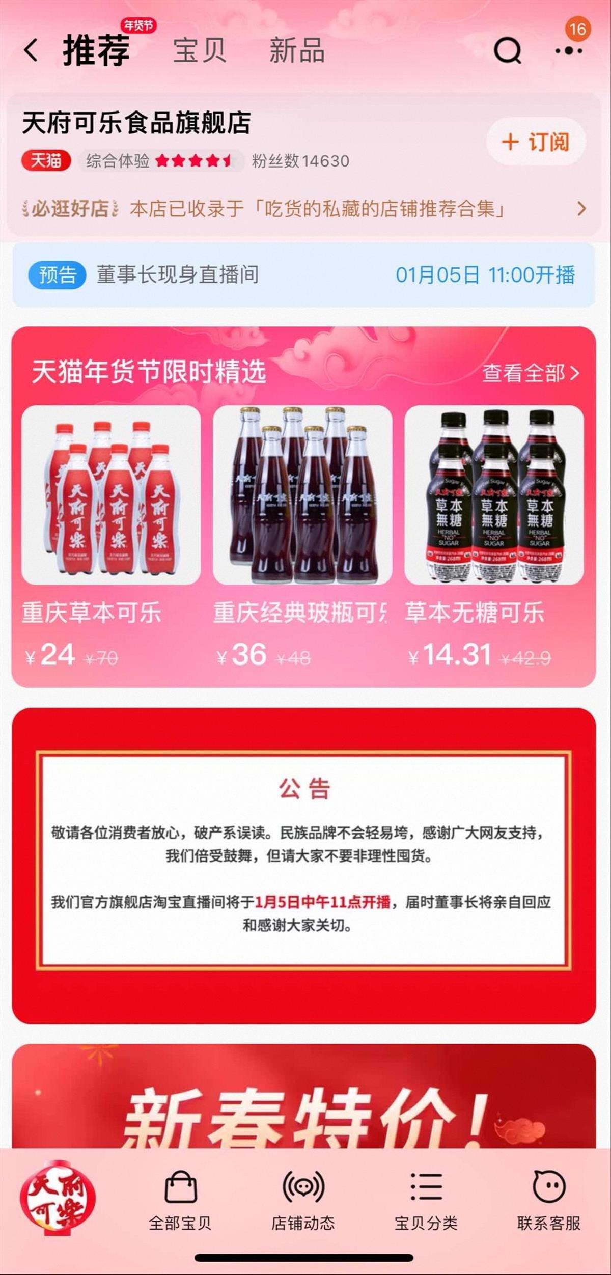 4日晚,天府可乐天猫旗舰店紧急挂出公告,称破产系误读,民族品牌不会轻易垮,感谢广大网友支持,还呼吁消费者理性消费。