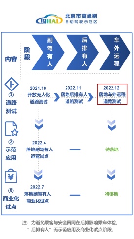 基于先期积累的技术验证与管理经验,此次全无人道路测试的开放,在既往申请主体、测试车辆等符合分阶段要求的基础上,针对“车内无人、车外远程”,增加了车辆远程协助平台保障、紧急事件安全响应等适配性申请要求,安全有序推进整车无人。