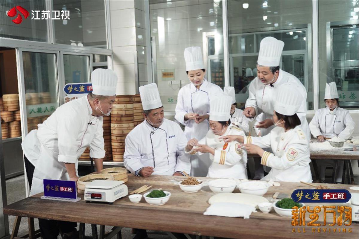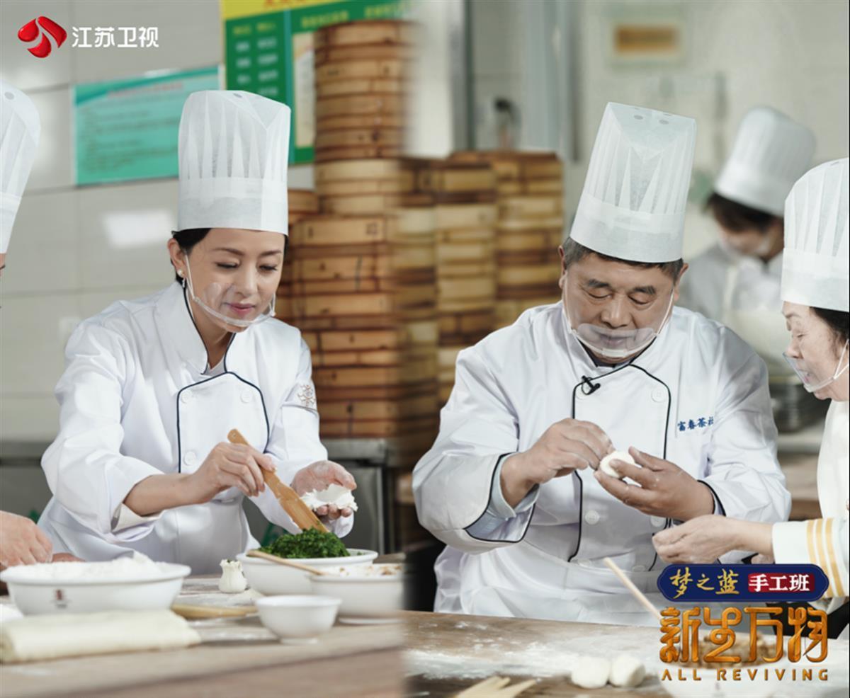 杨澜和单霁翔与两位新锐设计师组队后一同走进富春茶社的后厨白案区,向国家级非遗传承人徐永珍、富春茶点制作技艺传承人叶千金“拜师”,学习三丁包和翡翠烧麦的制作。