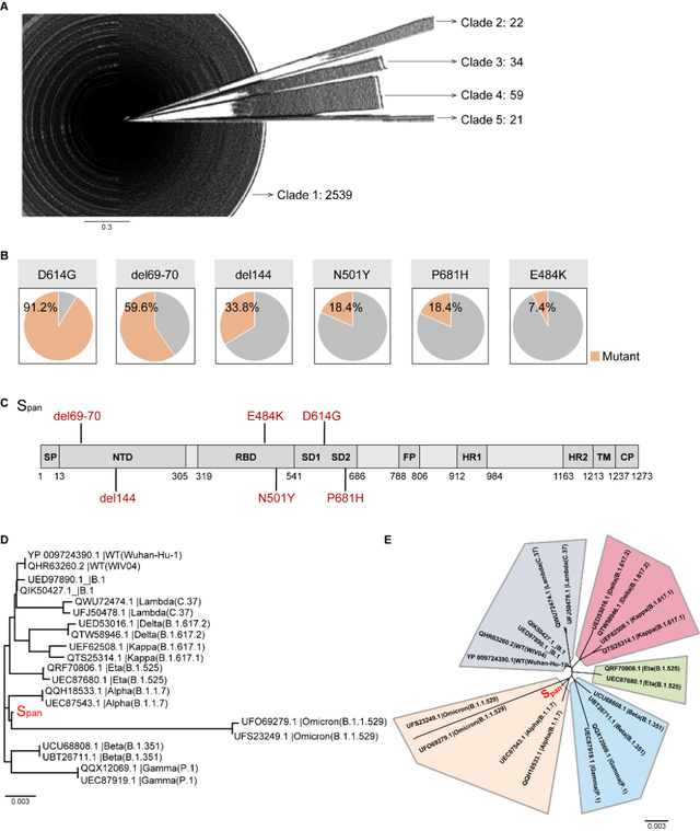 S蛋白突变的路径不同导致了抗原性的改变。因此,单一毒株的疫苗成分无法有效保护人群对抗不同进化路径上的其它变异株。为了获得一个能够覆盖绝大多数变异株的广谱免疫原,研究团队分析了NCBI数据库中的2675条新冠病毒S蛋白序列,通过进化聚类(图3A),计算所有突变位点的发生频率(图3B),最终设计了一种覆盖共性突变的拟合新抗原(Span)(图3C)。结果表明,Span序列位于S蛋白系统发育树的中心位置(图3D)。