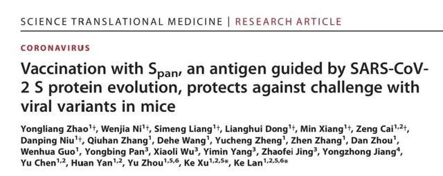武汉大学病毒学国家重点实验室蓝柯教授和徐可教授团队通过追踪新冠病毒刺突蛋白(S蛋白)的进化和突变规律,提出了“基于病毒进化共识序列,优化设计疫苗免疫原”的广谱疫苗设计新策略,该成果早在2021年12月23日发表于预印本平台bioRxiv,并于2023年1月4日经同行评议,正式发表于著名学术期刊SCIENCE Translational Medicine(《科学.转化医学》)。研究以“Vaccination with Span, an antigen guided by SARS-CoV-2 S protein evolution, protects against challenge with viral variants in mice”为题,研发了一种覆盖“共性突变”的广谱疫苗免疫原Span(泛新冠病毒S抗原),可诱导产生针对阿尔法(Alpha)、贝塔(Beta)、伽马(Gamma)、伊塔(Eta)、卡帕(Kappa)、德尔塔(Delta)、拉姆达(Lambda)和奥密克戎(Omicron)及其亚系在内的广谱中和抗体,保护实验小鼠抵抗包括Omicron在内多种新冠病毒变异株的致死性攻击。