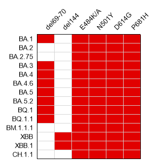 图4.研究团队发现的6个共性突变位点(横向标记)在后来爆发的Omicron流行株(纵向标记)中均有很大程度的保留(红色表示该位点保留)。