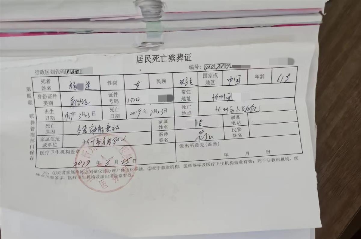 死亡证明显示,杨某连已于2019年离世(视频截图)