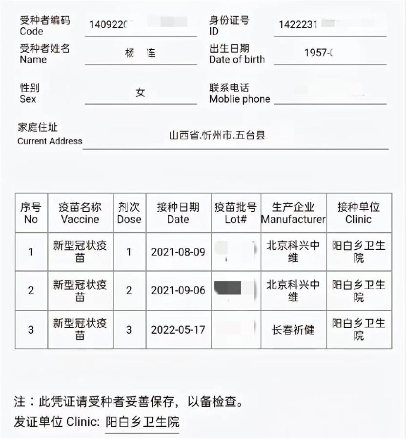 网友提供的预防接种凭证显示,受种者姓名杨某连,1957年出生。新型冠状病毒疫苗共接种三针,分别在2021年8月、2021年9月、2022年5月接种,接种单位均为阳白乡卫生院。