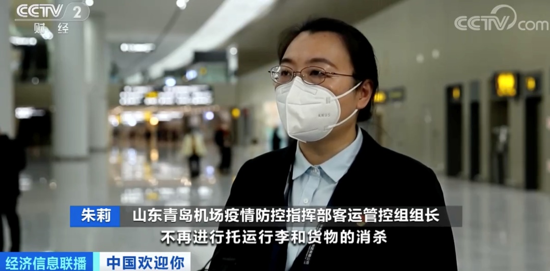 山东青岛机场疫情防控指挥部客运管控组组长 朱莉:飞机落地后,不再进行托运行李和货物的消杀,旅客通行效率大幅提升。据初步统计,旅客从下机到提取完行李的全过程平均只用了40到50分钟,相较于之前两个半小时的保障时间缩短了三分之二。