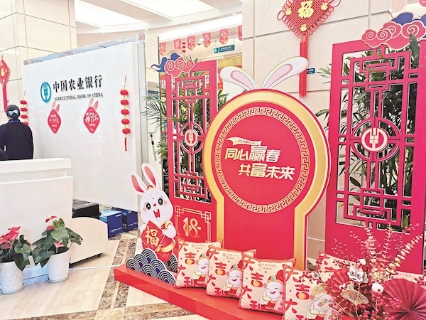 在农业银行武汉东湖支行营业室,记者看见大厅中,布置了两扇红色仿古雕花“门”,门前门后装点着灯笼串、中国结、朱色小果、绯红折扇,烘托出一片喜庆红火的氛围,几只抱着“福”字的小萌兔,告诉大家“兔年”就要来了。