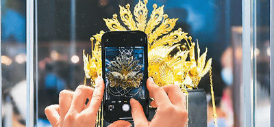在海南省海口市举办的第二届中国国际消费品博览会上,一件国产黄金头饰吸引观众拍照分享。新华社记者 杨冠宇摄