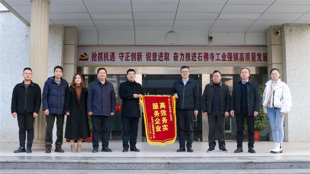 1月6日,华电湖北新能源有限公司党委书记刘合兵到访石佛寺镇人民政府,将一面锦旗交到镇党委书记彭小勇手上。