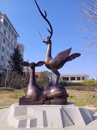 1978年云梦城关东南珍珠坡一号楚墓出土了“卧鹿立鸟”木雕。该雕塑造型奇特,构思新颖,动静巧妙结合:“卧鹿立鸟”雕塑让一只振翅欲飞的鸟站立在一头恬静的翘首俯卧的鹿背上,把鹿的角大胆地移到鸟头上,给人一种静者愈静,动者欲冲天而起的感觉。此后,云梦按照“卧鹿立鸟”原样放大,制成大型铜雕“卧鹿立鸟”。