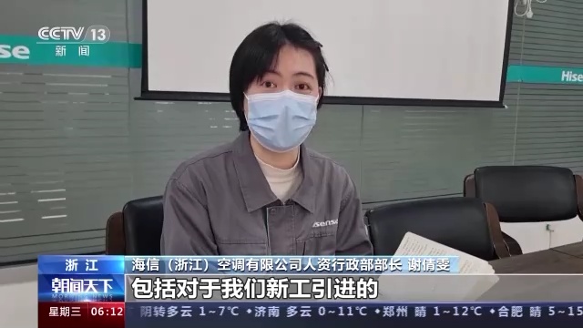 海信(浙江)空调有限公司人资行政部部长 谢倩雯:包括对于我们新工引进的1000块钱的补贴也好,或者员工返厂路费报销也好,对于工厂的留人包括引工,是有很大的帮助的。