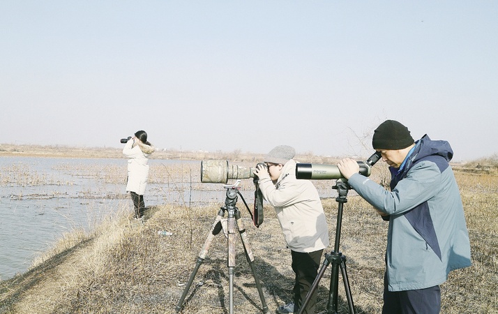 “苍鹭、白琵鹭、红头潜鸭……”李翔弓着身子,左手扶着望远镜,左眼紧闭,右眼贴着镜片,慢慢移动望远镜,口中不时念出一个个鸟儿的名字。
