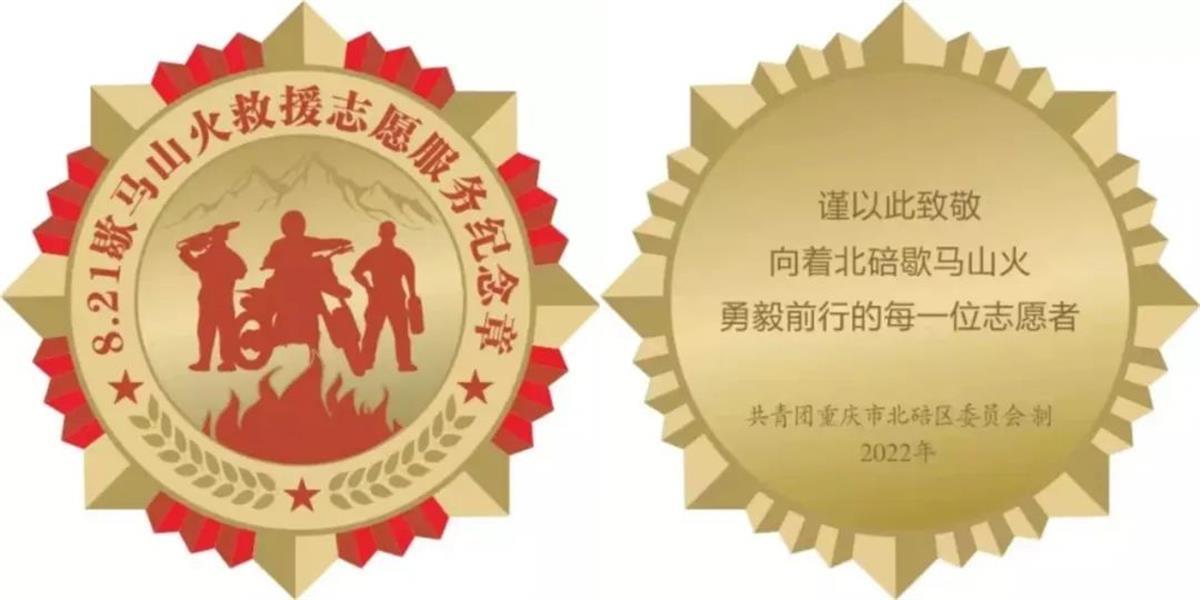 这枚金光闪闪的纪念章,正面印有摩托骑手、油锯手、拎着灭火器的志愿者形象,背面写着:谨以此致敬向着北碚歇马山火勇毅前行的每一位志愿者。一枚小小的勋章,一句质朴的话语,凝固了万人齐心奔赴一线、扑灭山火的动人时刻,镌刻了川渝儿女不畏艰险、保卫家园的英雄本色。