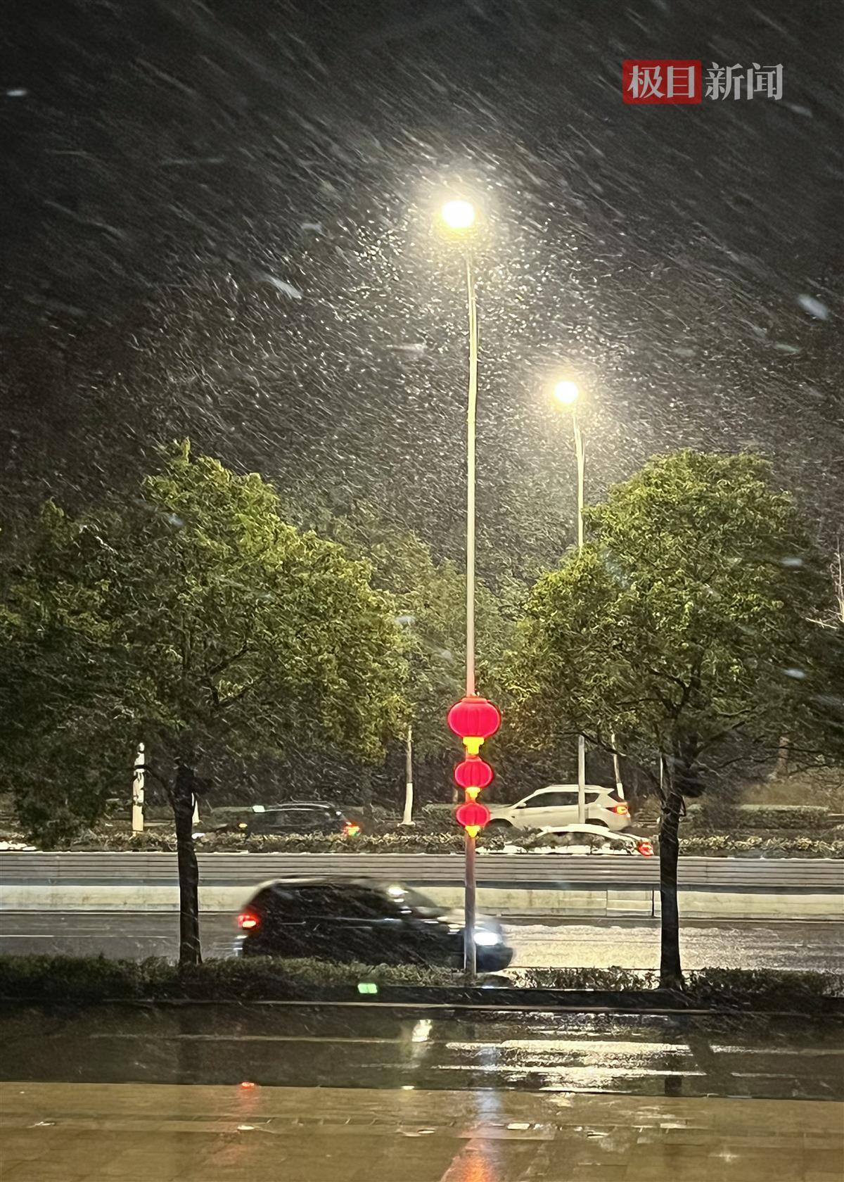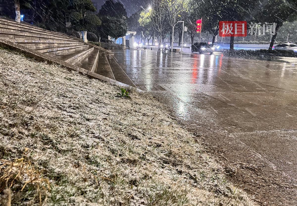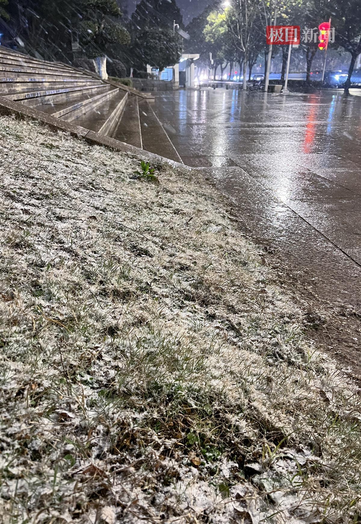 晚9时许,雪越下越大。晚10时许,武昌东湖路梨园段沿线的草坪上已有了一层薄薄的积雪。