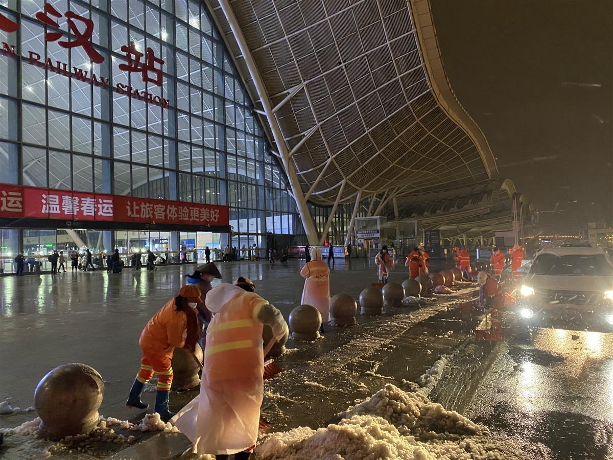 近日,受冷空气影响,武汉市迎来寒潮天气,气温大幅下降并伴有大风。为防止此轮寒潮天气对旅客出行造成影响,武汉火车站站区办全面调度,整合站区各方力量,全力做好站区融雪防冻工作,保障旅客出行顺畅。