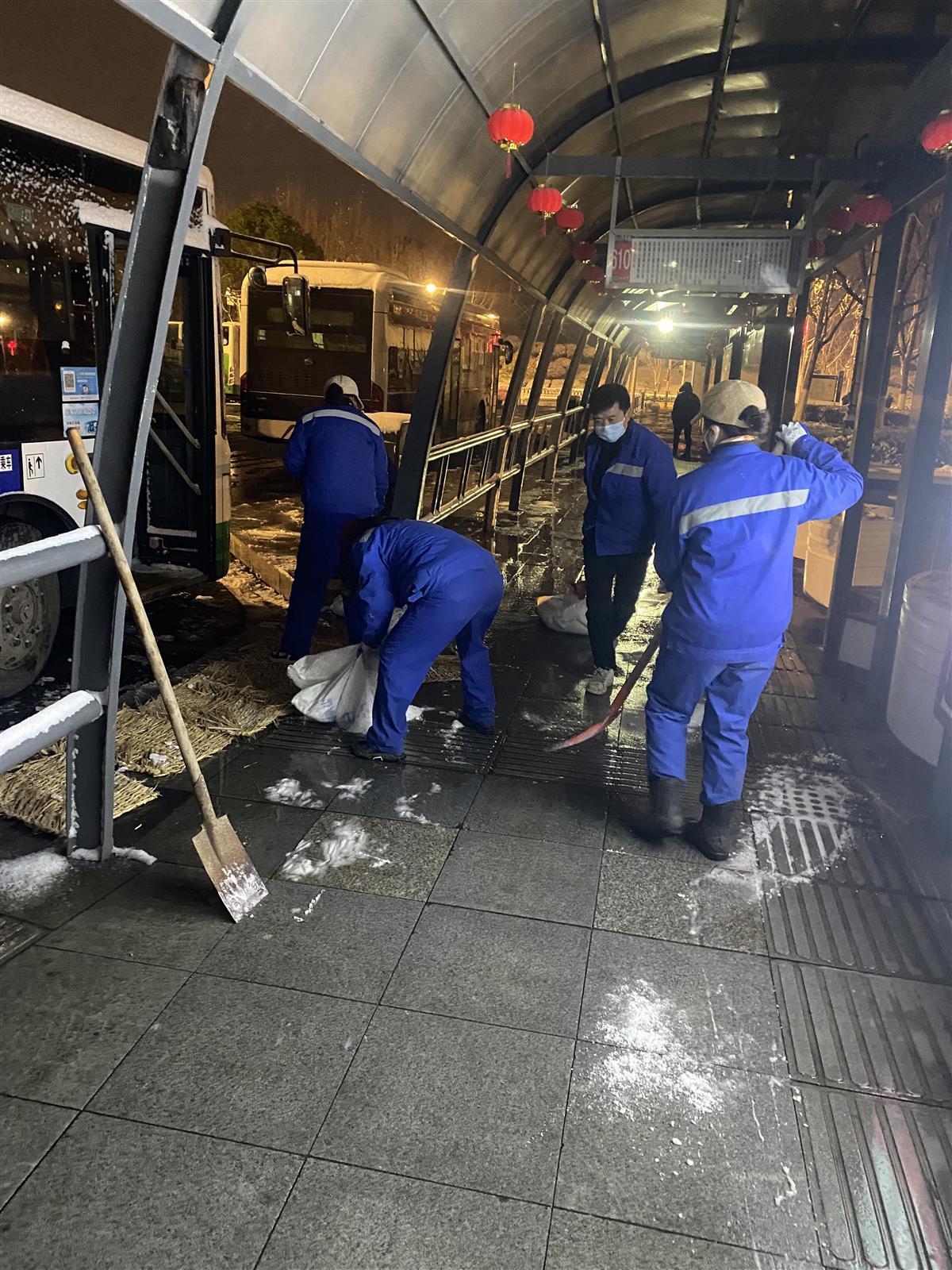 1月14日20时30分许,武汉“初雪”悄然而至,武汉火车站站区办出动突击队员95人,在站区团结大道、和谐路、白云路、黄鹤路、东西高架、公交站台、东西广场等地开展不间断巡查,重点对东西高架积雪进行清扫,出动撒盐车辆3台、撒融雪剂12吨,对东西广场、公交站台等地铺设麻袋1000条。从14日22时至15日清晨6时,站区办对东西高架及主次干道进行了8轮不间断撒融雪剂,防止结冰打滑,确保武汉火车站东西高架及主干道通行正常。