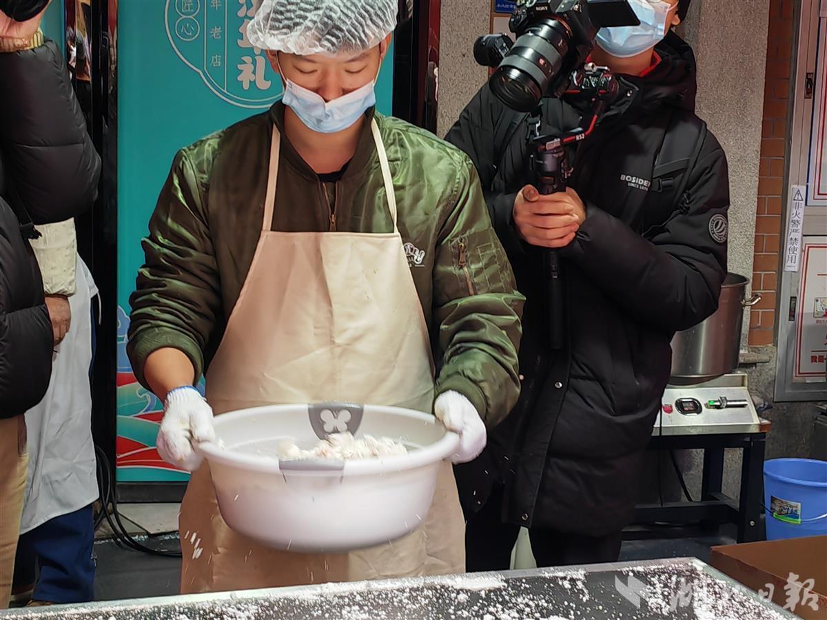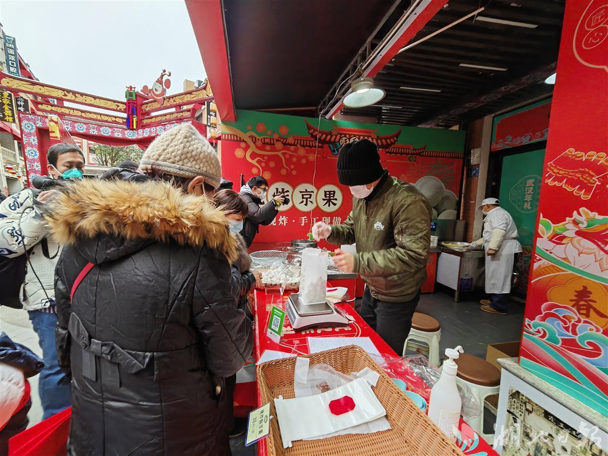 满街的红灯笼下,德华楼、汪玉霞等汉味老字号新鲜制作的餐品,引得大批市民排队购买。在汪玉霞摊位,两名师傅穿着全套工作服,现炸京果。他们身后,铁锅里热油腾腾,原料入锅后几分钟即被师傅熟练捞起,裹上糖浆和糖粉,在大盆中上下摇晃,直至每粒京果上的糖粉均匀一致。