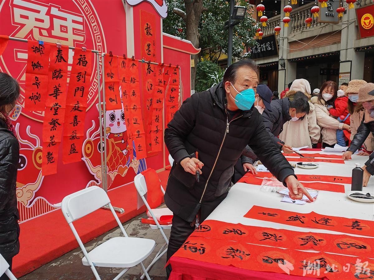 当天,活动现场还邀请了武汉市首届百姓明星选拔大赛的优秀选手带来丰富多彩的文艺节目,吸引许多游客和行人驻足观看;多位书法家及民间工艺剪纸艺术家在现场挥墨剪纸,写春联、剪福字,喜庆氛围浓厚……40余个摊位上,吃喝玩乐一应俱全,不断有市民赶来尝鲜。